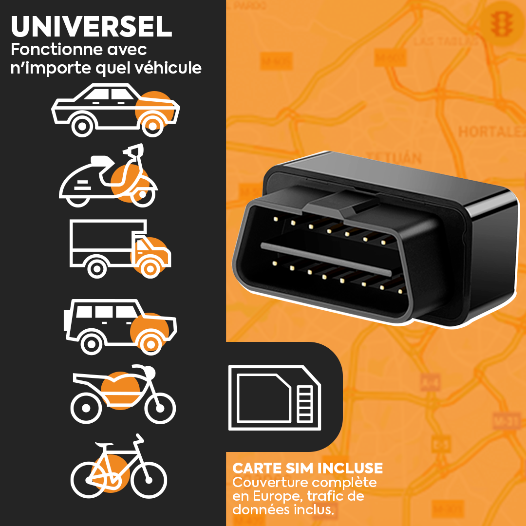 GPS OBD Car, Motorcycle and Truck Tracker – Tracker avec SIM intégrée – Alerte antivol – Overspeed and Safe Zone – Tracking avec Mobile App – Abonnement flexible