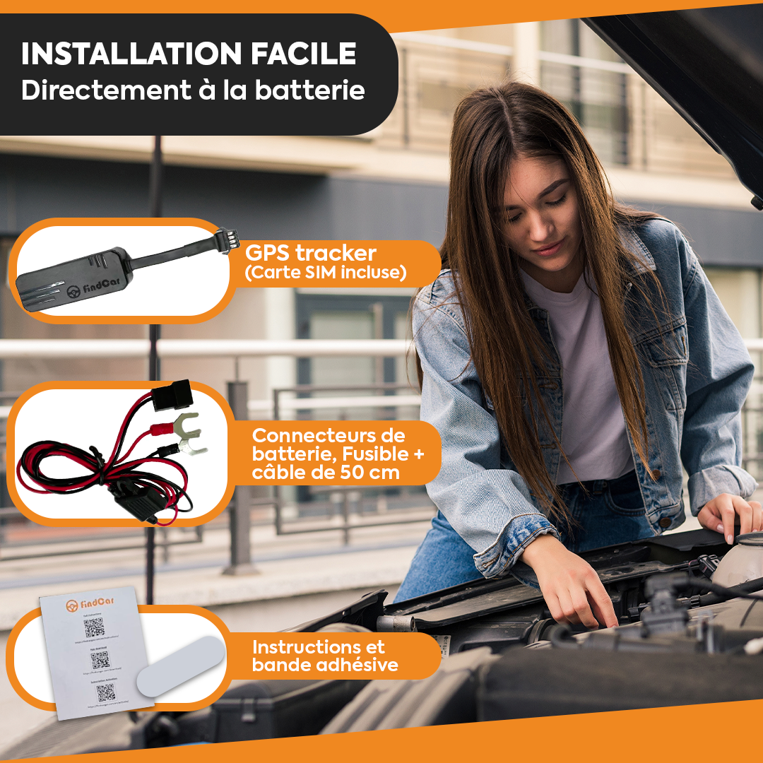 Traceur GPS pour voiture, moto et camion avec connexion directe à la batterie et carte SIM intégrée, traceur avec application, antivol, géofence et alerte de survitesse, abonnement flexible