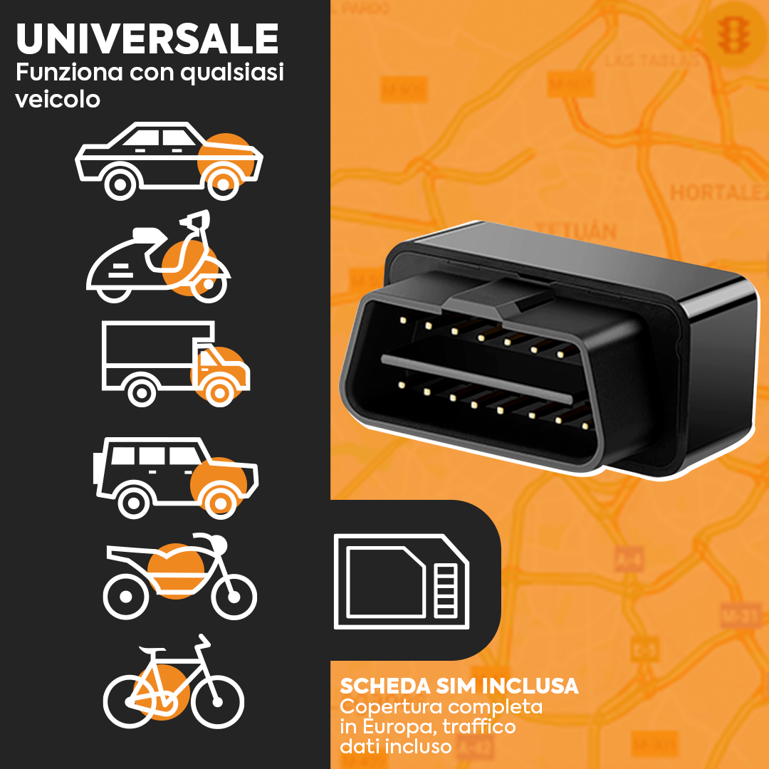 Tracker GPS OBD per auto, moto e camion – Tracker con SIM integrata – Allarme antifurto – Zona di sicurezza e sovravelocità – Tracciamento con app mobile – Abbonamento flessibile