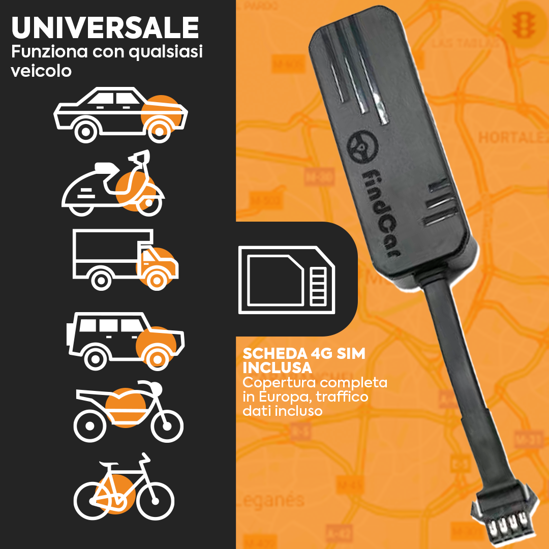 - TRACCIAMENTO IN TEMPO REALE CON TECNOLOGIA 4G: il localizzatore GPS FindCar 4G ti permette di visualizzare la posizione del tuo veicolo in tempo reale dall’app mobile. Compatibile con Android e iOS. Ideale per auto, moto, camion e flotte commerciali.
